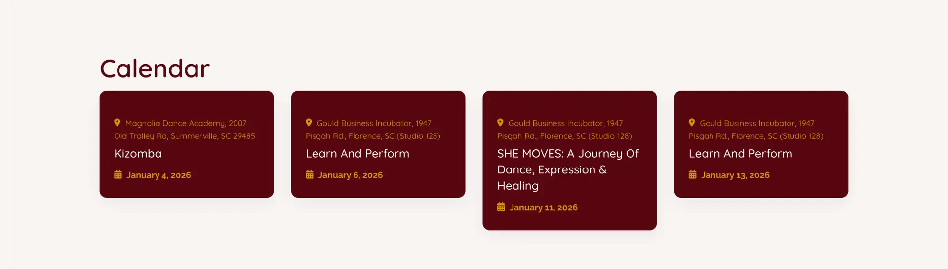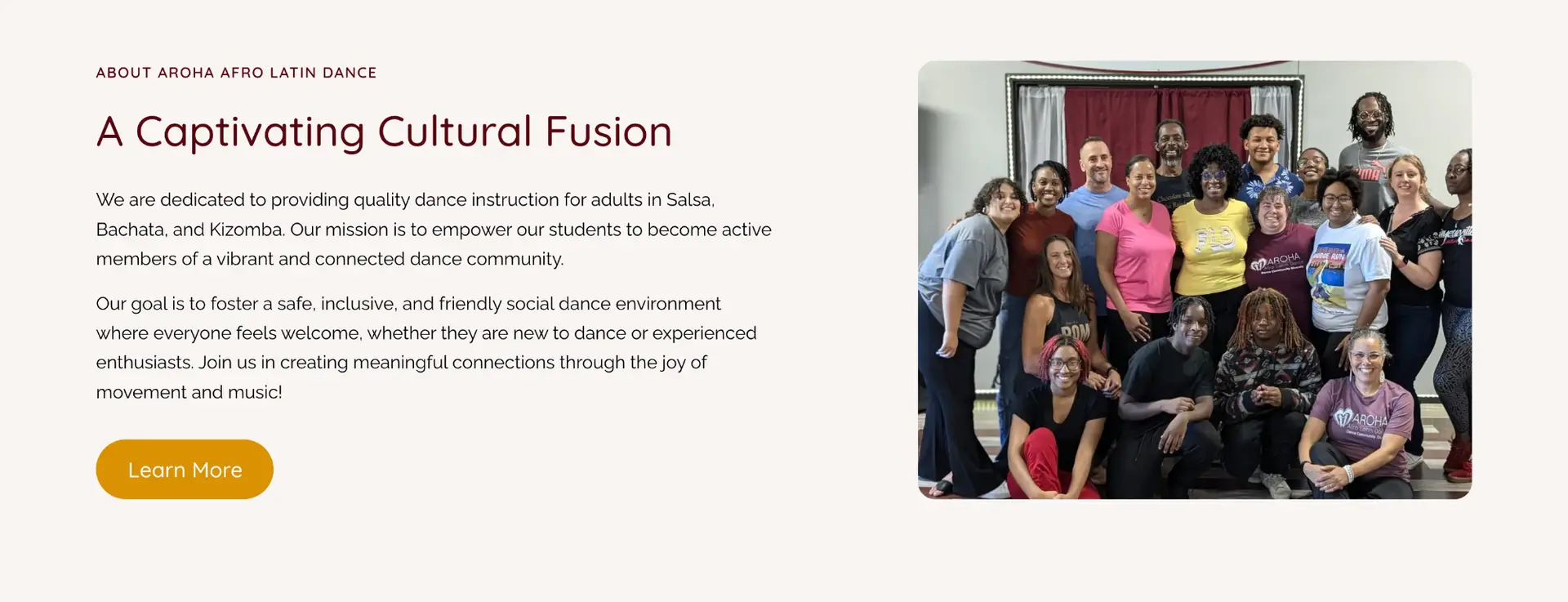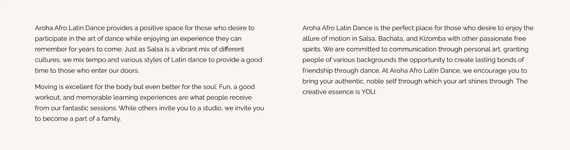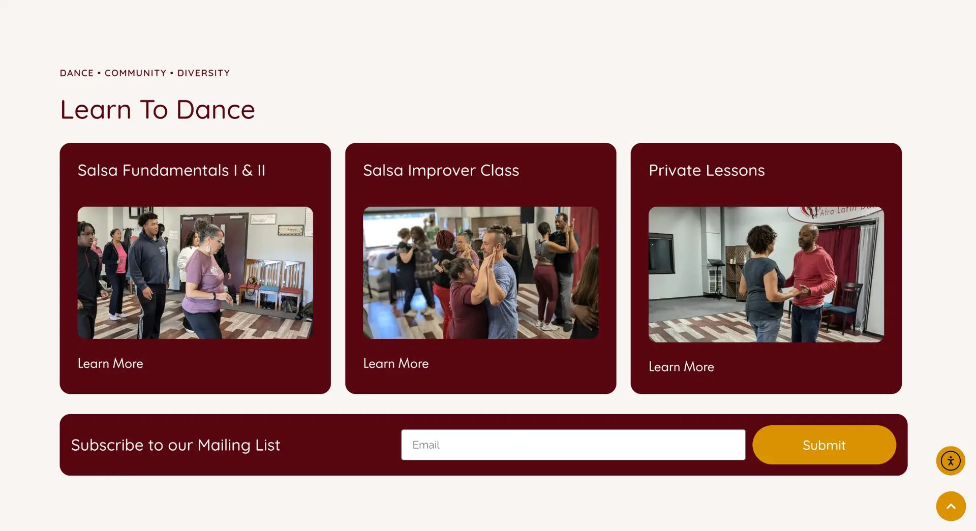 Leveraging the flexibility of WordPress, we developed a mobile-responsive site featuring an intuitive navigation structure that categorizes dance programs into clear, actionable learning phases. The solution integrates location-specific landing pages and a simplified e-commerce checkout to reduce friction for new student registrations and event bookings.