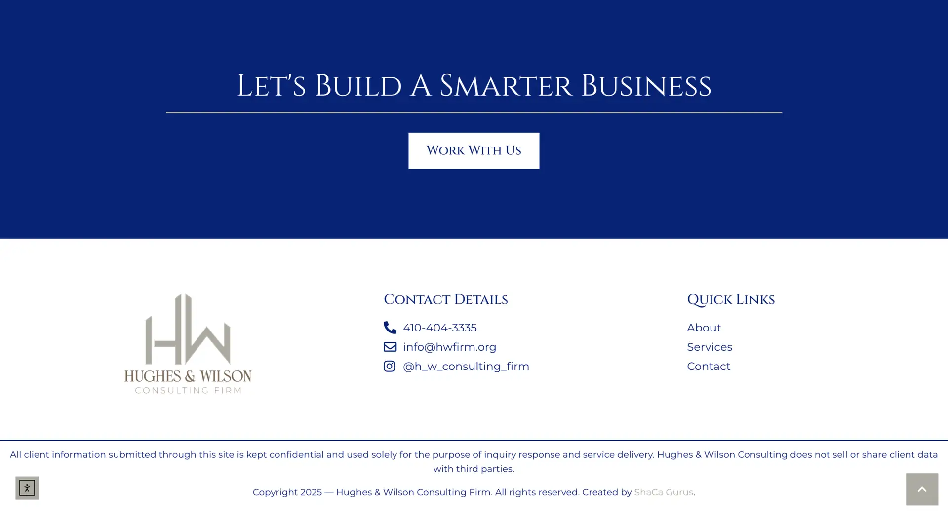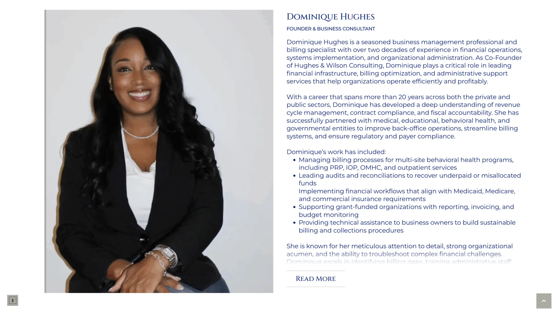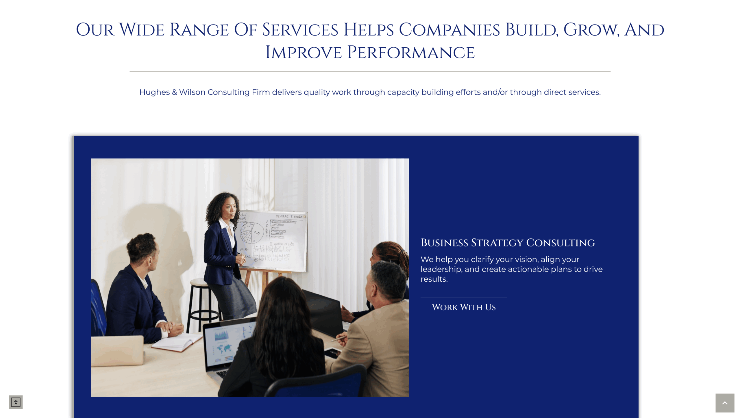 The template-based build gave Hughes & Wilson Consulting Firm a fast path to launch without sacrificing quality. The site now serves as a focused destination where clients and visitors can quickly understand their value and clearly present who they are and what they offer.