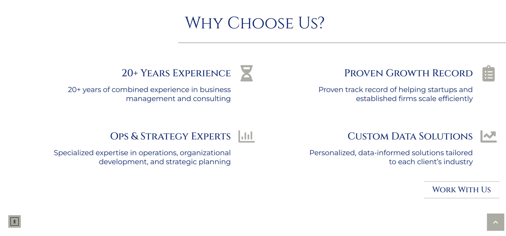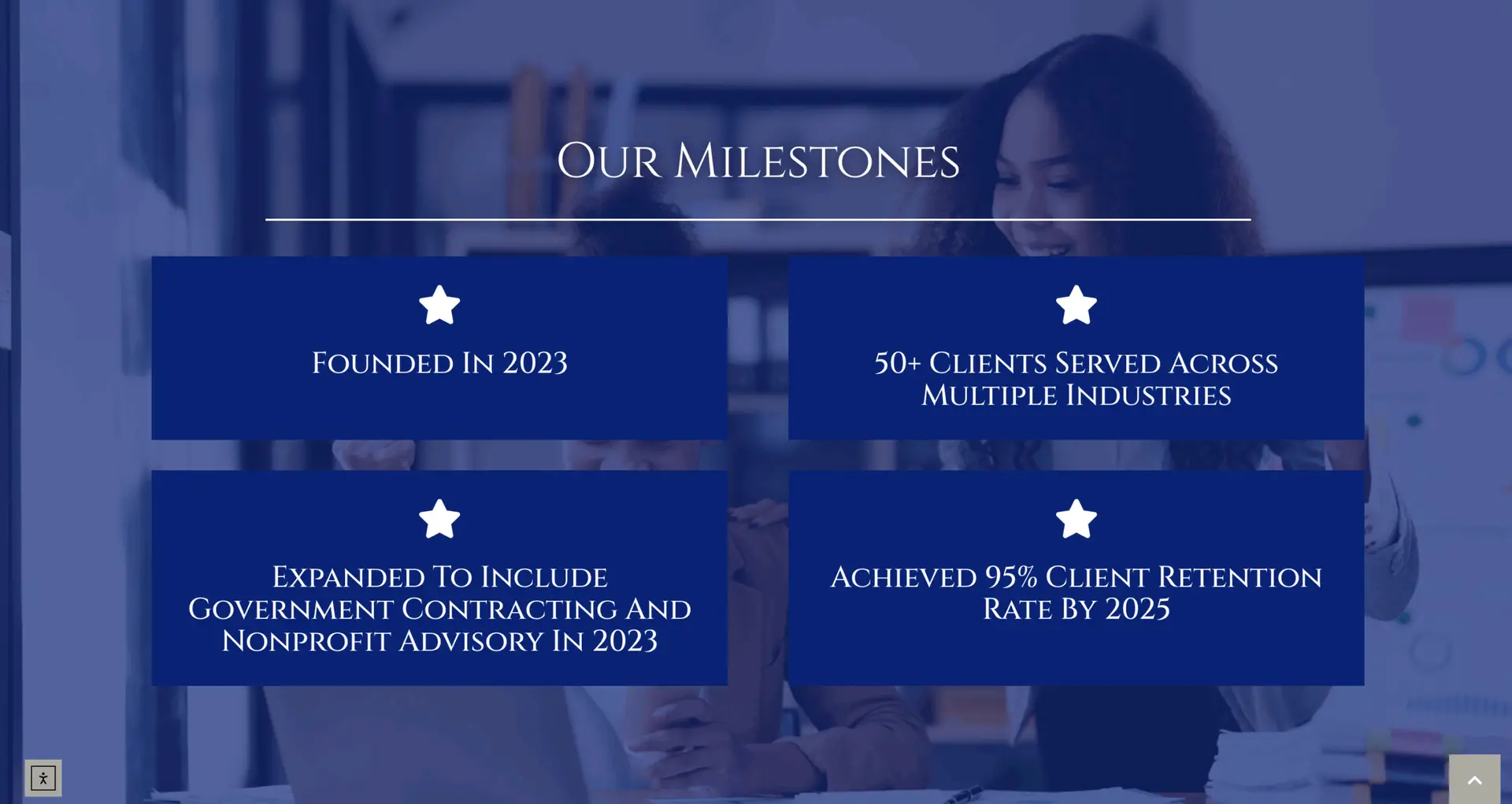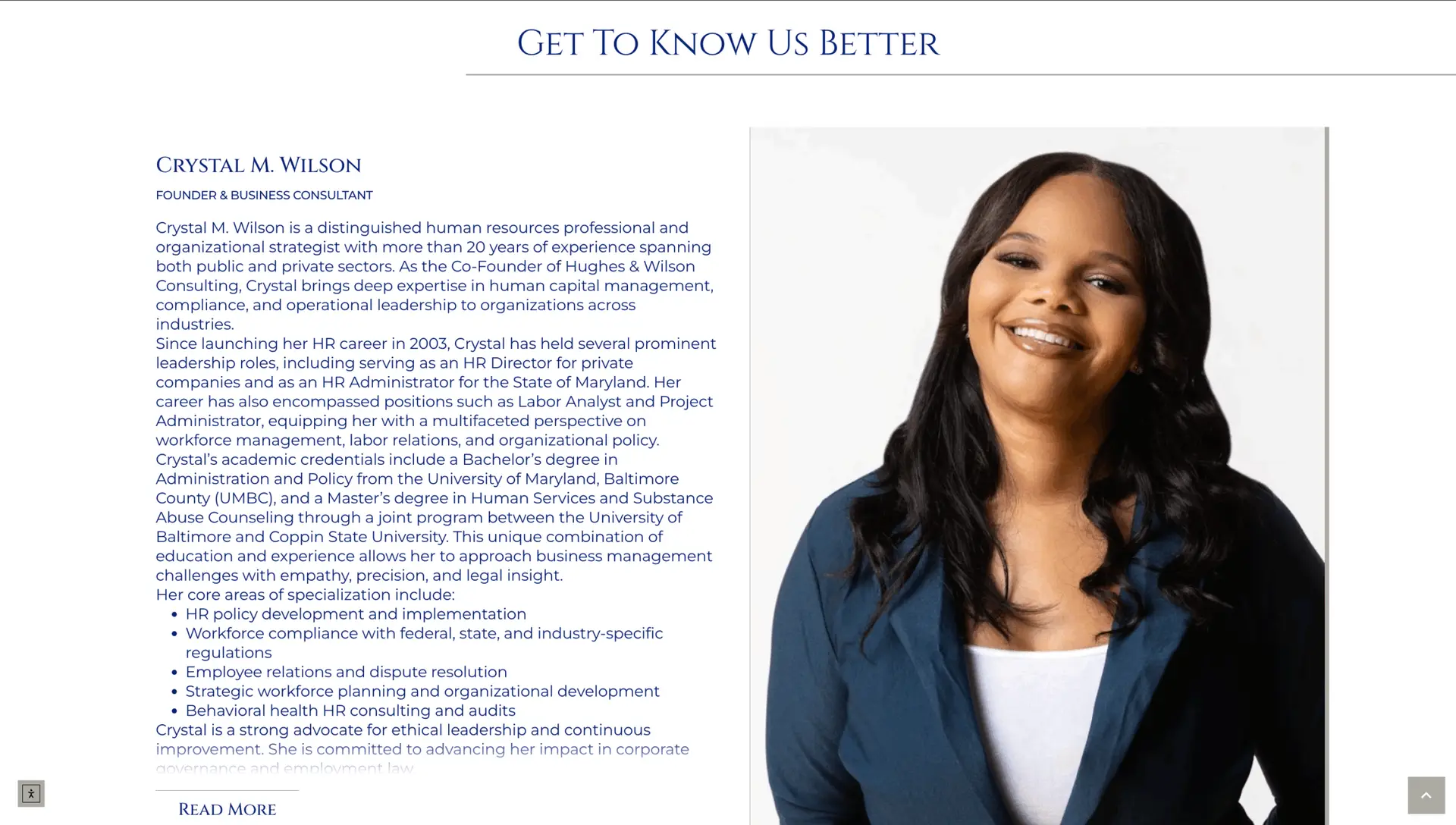 The template-based build gave Hughes & Wilson Consulting Firm a fast path to launch without sacrificing quality. The site now serves as a focused destination where clients and visitors can quickly understand their value and clearly present who they are and what they offer.