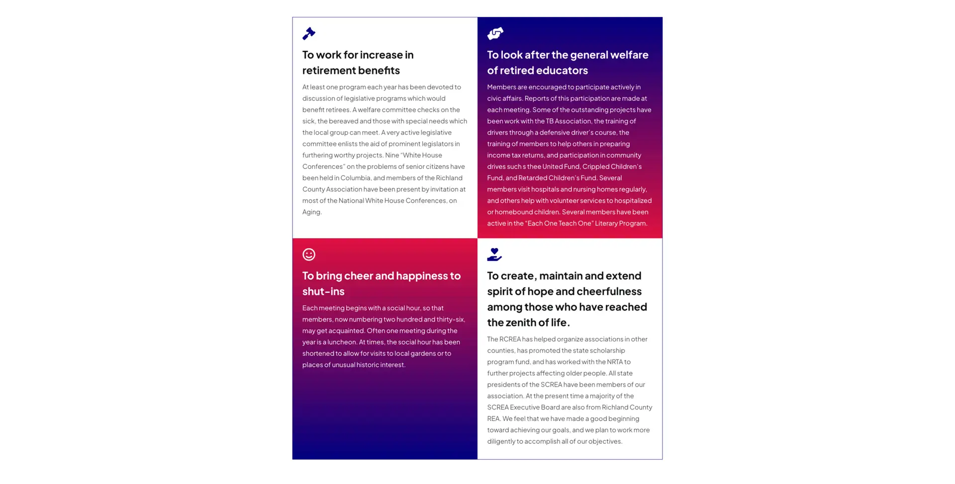 Richland County Education Association–Retired needed a dedicated online home for its members and supporters. As a non-profit focused on retired educators, they wanted a site that clearly explained who they are, made it easy for members to stay engaged, and simplified key actions like joining, reserving luncheon seats, donating, and getting in touch. Because this was a new build, the goal was to create a clean, welcoming presence that felt accessible to all users, including those who may not be tech-savvy.